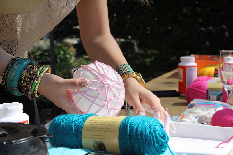 We continued Serra's wedding prep on Sunday with a backyard centerpiece making party. We picked up a ton of bright yarn in her wedding colors, and spent the day coating it in glue and wrapping it around balloons to make these fun, bright balls.